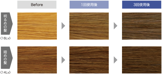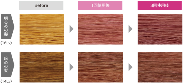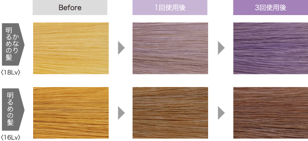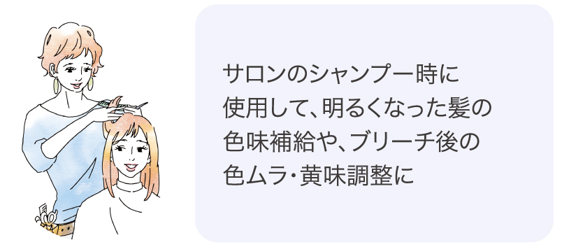 ハイトーンカラー後や、ブリーチ毛などの明るくなった髪に使用して、黄味を抑えたり、色味を補給することができます。