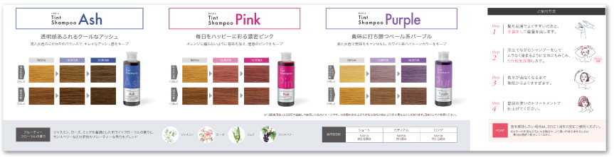黄味対策ではPurple。アッシュ系やピンク系に染めた方ですと、AshやPinkのカラーシャンプーで色味補充をご提案いただけます。