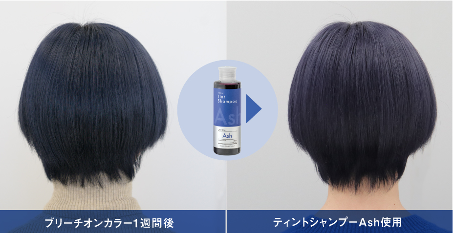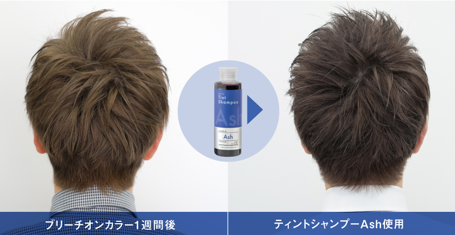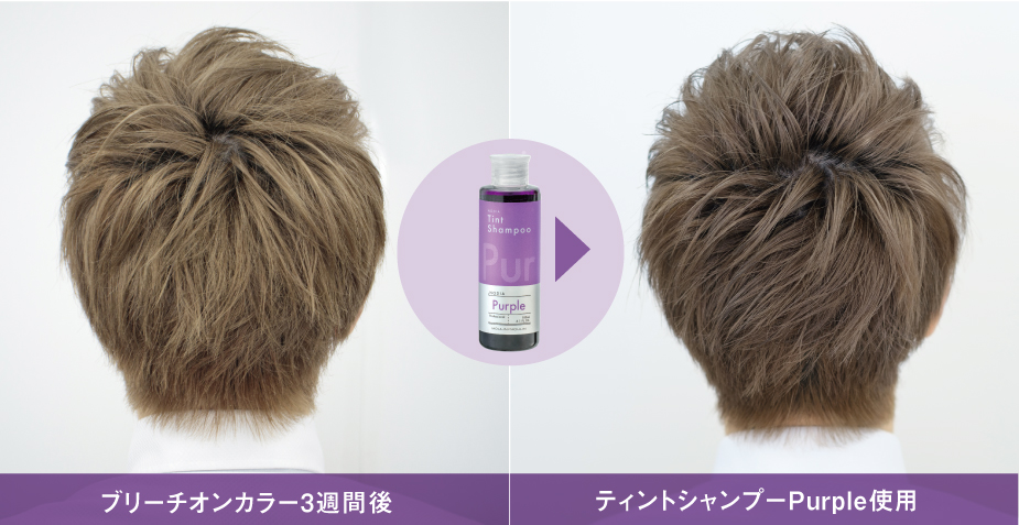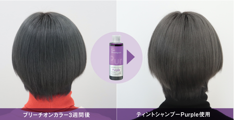 カラーシャンプーを使うことで、黄味が強くなるだけの褪色過程ではなく、ホワイト寄りのブリーチヘアーへの褪色過程を楽しんでいただけます。