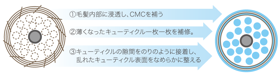 毛髪表面に働きかけ、キューティクルCMC成分のラメラ構造を補修し、髪のうるおいとツヤをキープします。