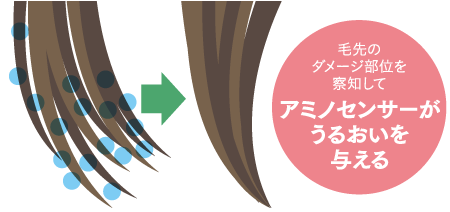 CMC成分(Wセラミド*1*2)と、ダメージした毛先に集中的にうるおいを届けるアミノセンサー*3で傷んだキューティクルを補修し、カラーの色ツヤをキープする美しい髪へ。