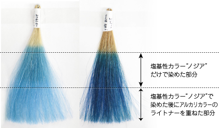 “NODIA”はビビッドな色味を楽しめる塩基性カラーであり、アルカリカラーによる変色の影響も起こらないことが確認できました!