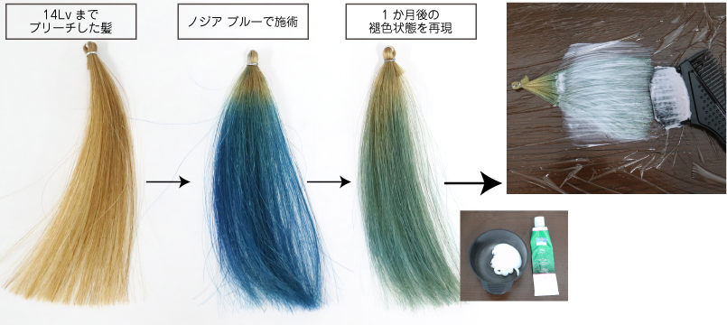 14Lvにブリーチしてノジア(ブルー)で施術後1ヶ月の褪色状態を再現した髪でアルカリカラーの7Lvアッシュを塗布しました