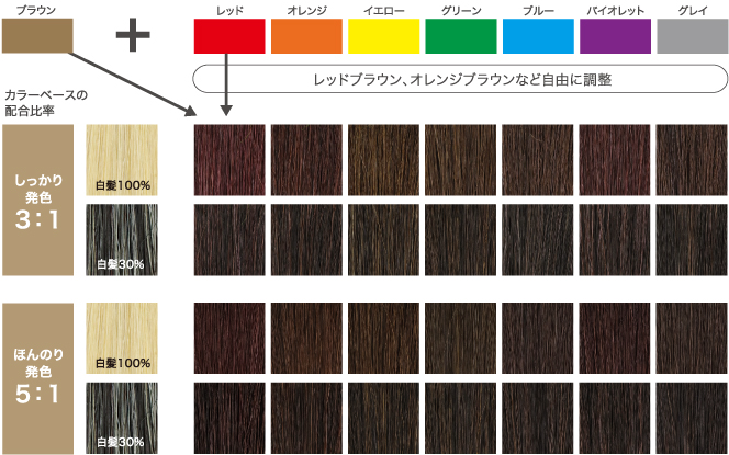 3原色などのカラーベースを組み合わせると色味の幅が広がります。3:1でしっかり発色しますが、白髪の染まりを優先するには5:1がオススメです。