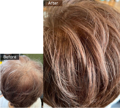 白髪率を活かして、ブラウンとベージュのMixレシピで明るい色味を入れて、白髪ぼかしに。髪が細くなったお客さまでもダメージを気にせずに染めることができます。
