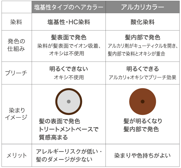 アルカリカラーと比べると染まり・色持ちは劣りますが、酸化染料を一切含まない点やアルカリカラーと染まりのメカニズムが違い、キューティクルと開いたり、髪を明るくリフトさせたりせずに染めますので、ダメージが抑えられる点が特長です。