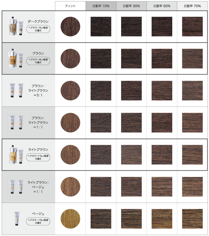 ライトブラウンとベージュのMixは既染部の使用にオススメします。白髪ぼかしとしてはご利用いただけますが、色持ちはよくありません。