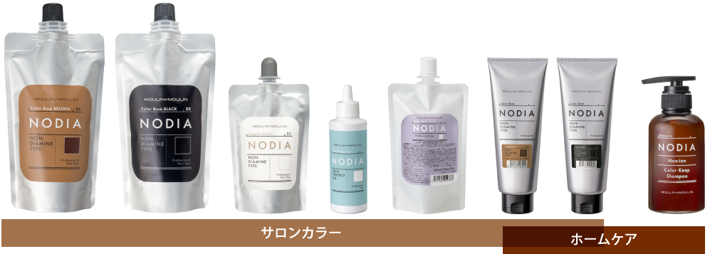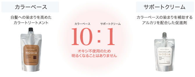 ノジアは、トリートメントベースに塩基性・HC染料を処方した『カラーベース』と、その染まりを補助する『サポートクリーム』を10:1で混合して使用することで、サロンカラーだからこそできる「染まり」と「質感」を実現します。