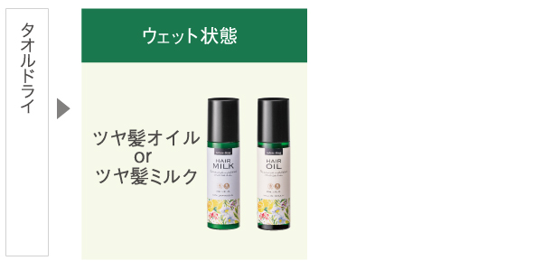 “ツヤ髪オイル/ツヤ髪ミルク”もドライヤーやアイロンの前につけていただくことでトリートメント効果を高めることができます。単品でお使いいただく場合は、夜はタオルドライ後のウェット状態でお使いください。