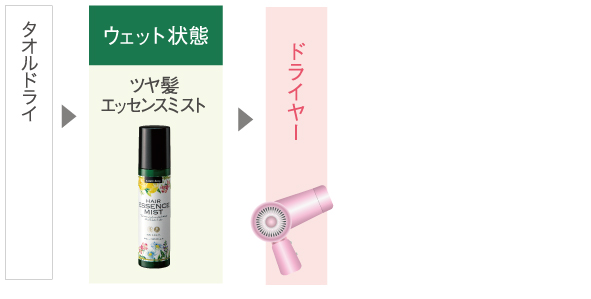 “ツヤ髪エッセンスミスト”は内部に浸透させた成分が熱で定着しますので、ドライヤーやアイロンの前にご使用いただくのが効果的です(乾かし時の温風程度で定着します)。