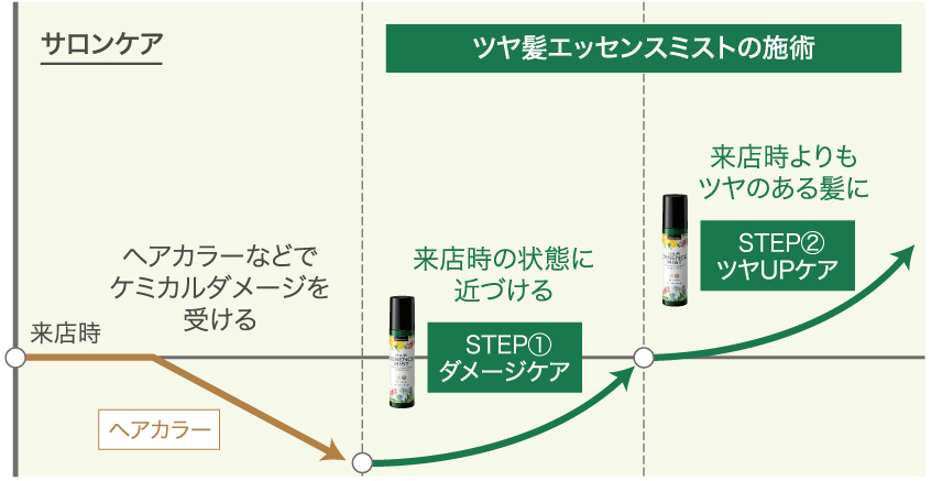 ブローやアイロンの前にミストを塗布して仕上げていただくことで、仕上がりの手触りの良さやあふれるツヤ髪をお客さまに実感していただくことができます。