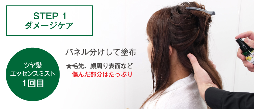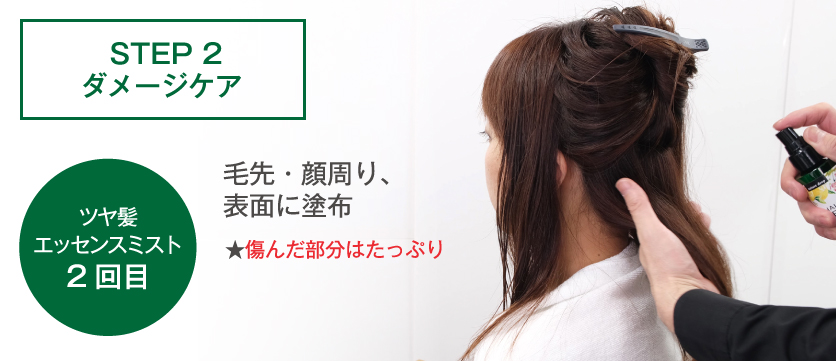 ツヤ髪エッセンスミストをサロンの仕上げでご使用の際は、仕上げ前の『タオルドライ後』と『8割ドライ後』の2回に分けて塗布すると、ツヤや手触りが高まるのをより実感していただけます。