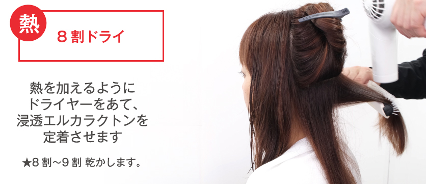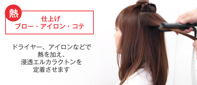 ドライヤー、アイロンなどで熱を加え、浸透エルカラクトン※1を定着させます。