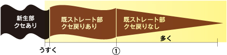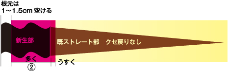 クセ戻りなし部は多く、クセ戻りあり部はかなり薄めに塗布します。新生部5mm程度にオーバーラップします。 - クセを伸ばしたい新生部に第1剤塗布