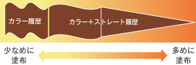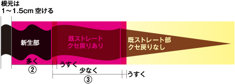 既ストレートの中間〜毛先は多く、境目は少なく塗布します。新生部5mm程度にうすくオーバーラップします。 - クセを伸ばしたい新生部に第1剤塗布