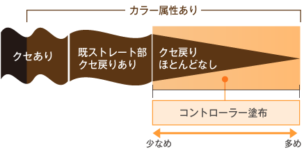 カラーダメージは少なく、クセの戻りを優先する場合は、コントローラーはクセ戻りがほとんどない部分(~クセの戻りが少しある部分)のみに塗布し、クセを伸ばしたい部分は処理剤と1剤の強度選定で調整します。