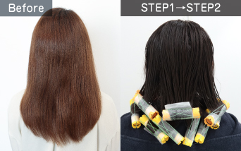 通常はコスメ系カーリング料を使用した上で、優先する施術を後に行うことで対応しますが、毛先カーリングで作るスタイルでカラーも活かした事例をご紹介します。