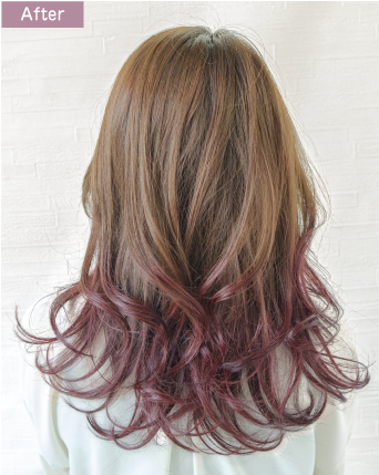 ヘアカラー後にカーリングをすると色落ちしてしまうため、最初からカーリング部分は避けてヘアカラーを行い、カーリングした部分は裾カラーで華やかさを出しました(裾カラー部分の事前明度が暗い場合は鮮やかな色味は出ません)。