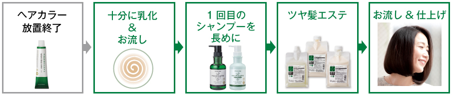 シャンプー台で同時に行うと、通常のカラー施術+10分で施術可能になります。しかも、ツヤ髪エステ①のバッファー効果による残留アルカリへの対応もできるので、お客さまの満足度を高めるメニューを手軽に取り入れることができます。
