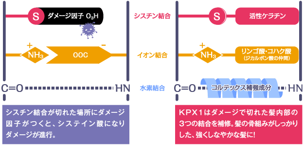 キューティクルの内部に「活性ケラチン※1」「ジカルボン酸※2」「コルテックス補強成分※3」を浸透させて、ダメージによって切れてしまった髪の結合を繋ぐことで髪を補修します。