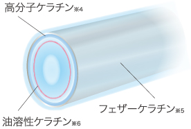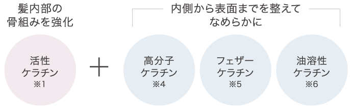 「高分子ケラチン※4」「フェザーケラチン※5」「油溶性ケラチン※6」が髪の内側からキューティクル表面まで、ケラチンで満たして弾力となめらかさを与え、強くしなやかな髪に導きます。