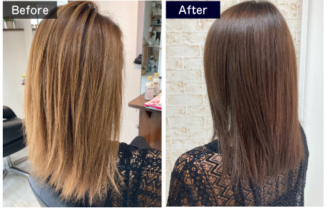 仕上げた後は毛先のごわつきが少なく、保水された感じが良くわかりました。ホームケアを渡したので、手触りと色持ちの持続も実感していただきました。