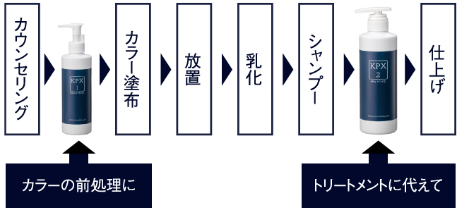 トリートメントKPXを組み合わせる際は、カラーの前処理としてトリートメントKPX 1を、普段お使いのトリートメントに代えてトリートメントKPX 2をご使用いただくだけ。通常の施術時間とほぼ変わらない時間でお使いいただけます。