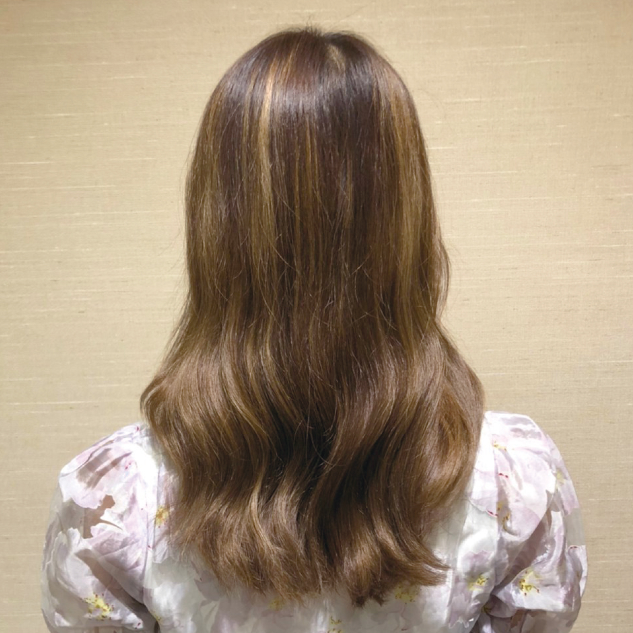 褪色部分やハイライトの黄味をしっかり抑え、毛先に向けて徐々に透明感のあるグレージュに。