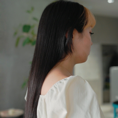 ブリーチ毛の暖色系カラーなので毛先が抜けてしまう可能性から、毛先から塗布して根元までワンタッチ。しっかり時間をおいて発色させる。