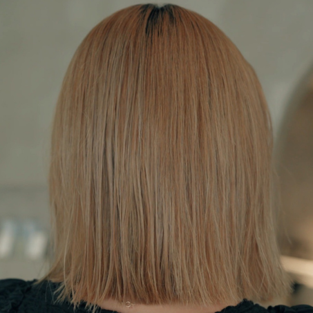 白っぽいくすみベージュにするためにSG(スモーキーグレイ)とGr(グレージュ)で程よいくすみを出し、BV(ブルーバイオレット)とP(ピンク)を補色として少し混ぜて白っぽさを出す。ハイライト履歴があるので、色ムラを防ぐためN(ナチュラル)を多めに混ぜる。混ぜすぎてくすみ感が弱くならないようにする。