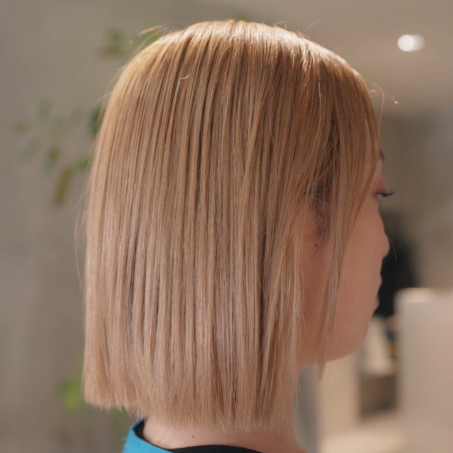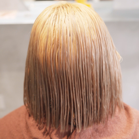 根元のみのブリーチなのでオンカラー時に根元と毛先の色味がブレないようにすること。