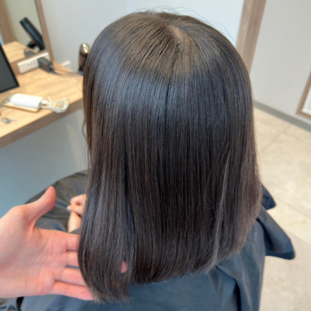 縮毛矯正履歴には寒色が沈み込みやすいため、オキシで薄めて塗布時間を短縮し、放置時間を10分で流します。
