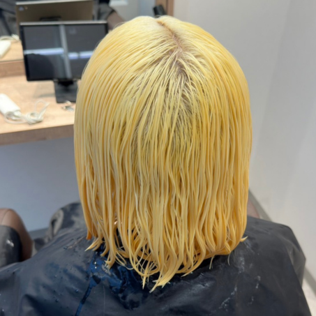 ブリーチで根元と毛先のダメージレベルを合わせてあるため、ワンカップで根元から毛先まで一気に塗ります。