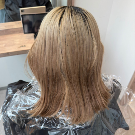 色落ちがグレイ寄りなので、ブラウン味のあるN(ナチュラル)を主体にしてベージュ感を出し、根元と毛先が色馴染み良くなるように全体の薬にSG(スモーキーグレイ)を補正で混ぜて、黄ばみ消しとして補色のBV(ブルーバイオレット)を混ぜています。