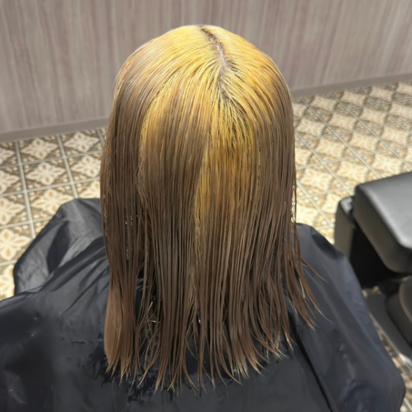 毛先は時間を置きすぎると暗く沈むため、根元の発色を確認してから塗ります。