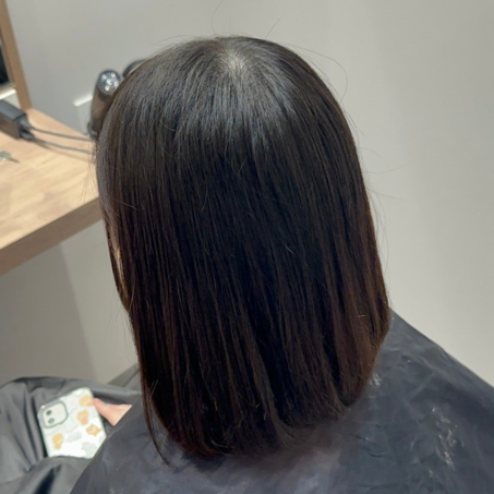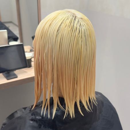 縮毛矯正履歴のため、まずは抜けるのがゆっくりなブリーチで明るく。カラーは黄味を完全に消したくなかったため、補色は採用せず、目的色のみで薄めて作っています。