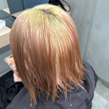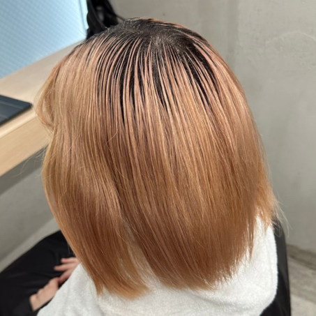 P(ピンク)は根元に入りやすく毛先に入りづらい色なのでベースの残留を上手く活かしてワンタッチ塗布で均一に。