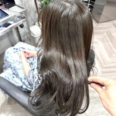 アッシュ味が強すぎない程よくくすんだグレージュをイメージ。根元は7A(アッシュ)を入れる事で、新生部の赤味を抑制し、トーンが上がりすぎるのを考慮。毛先はA(アッシュ)が出過ぎないようにBe(ベージュ)で調整し、5Si(シルバー)を入れることでアッシュ味が薄くなりすぎるのを考慮。毛先の沈みすぎを考慮しオキシは1.5倍に。