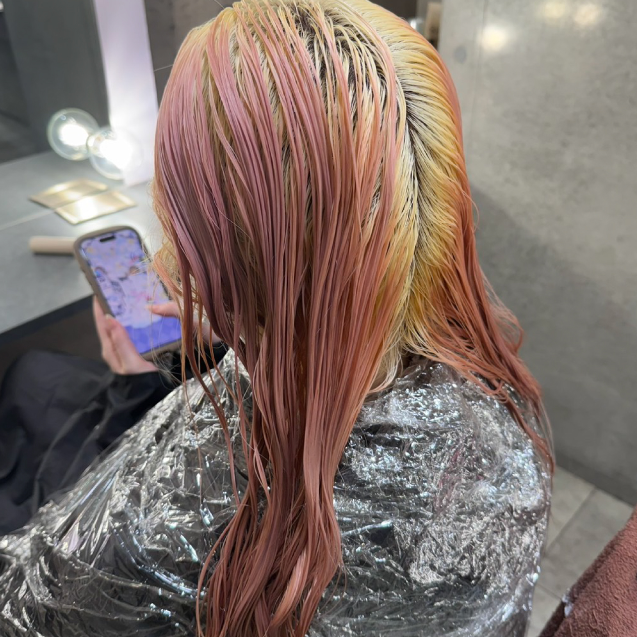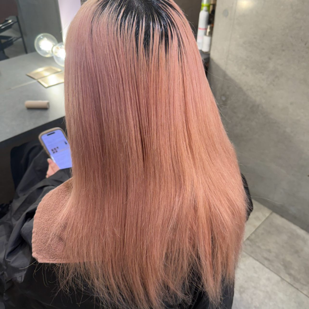 毛先にピンクシャンプーが残留していたため、根元のカラー中心でワンタッチで塗布。