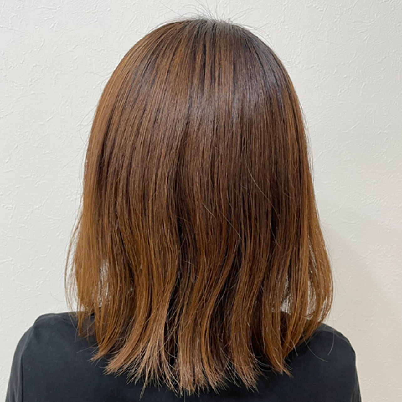 前回カラーが褪色して黄色系にかすれて傷んで見える事前状態の方。5Lv、7LvのP(ピンク)で施術して濃いピンクに。シンプルな施術でも、黄味を抑えて深みのある濃密なピンクに。