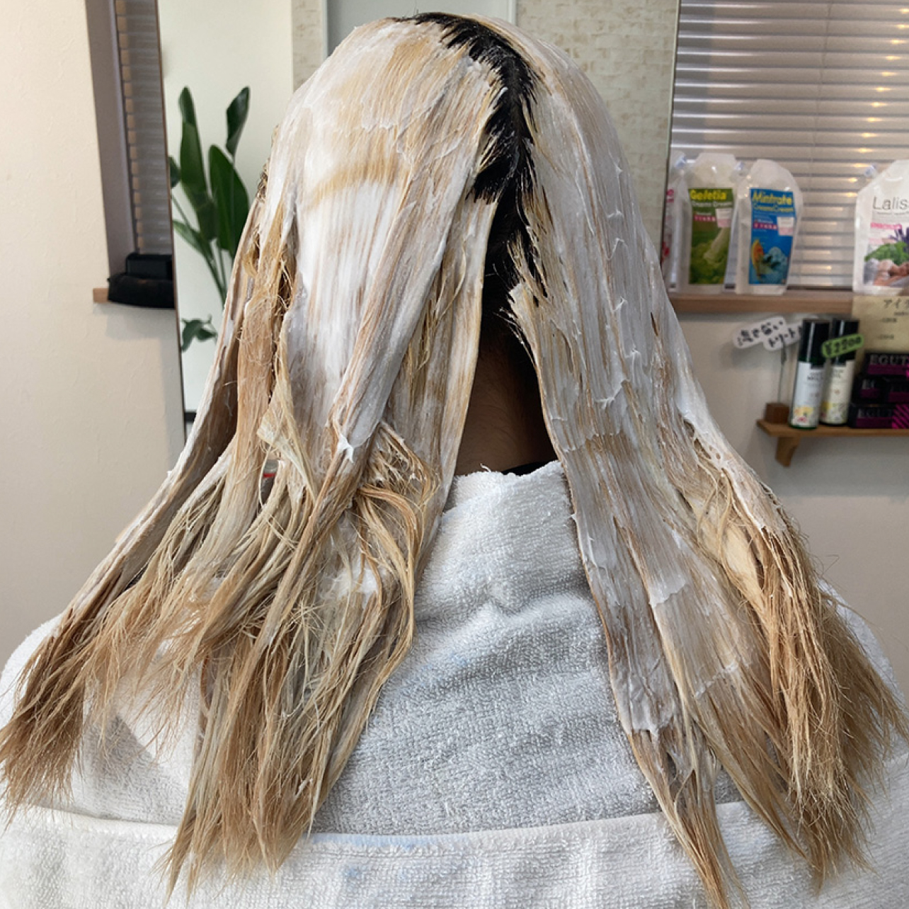塗布後10分→カラーチェック→コーミング→10分(通常よりも少し長めに置く)。