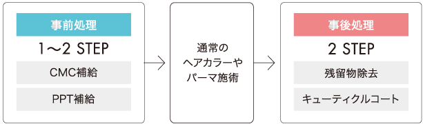 髪に不足したCMC・PPTを補う事前処理、施術後の残留物除去とデリケートなキューティクルをしっかりコートする事後処理。