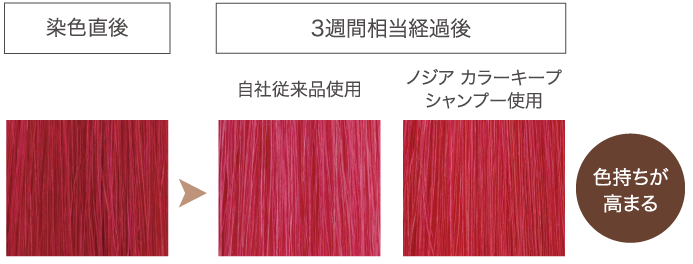 ※ハイブリーチ18Lv毛束をノジアカラー(レッド)で染めた後、自社従来品とノジア カラーキープシャンプーでそれぞれ洗浄